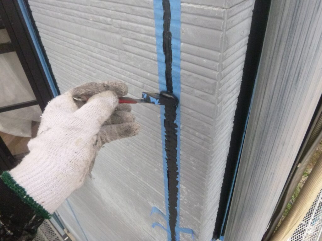 充填したシーリングをヘラで整えながら適量が残るようにしていきます。