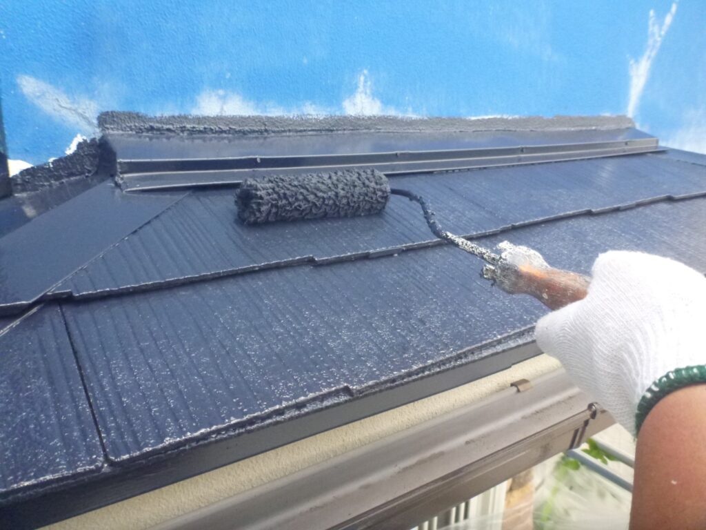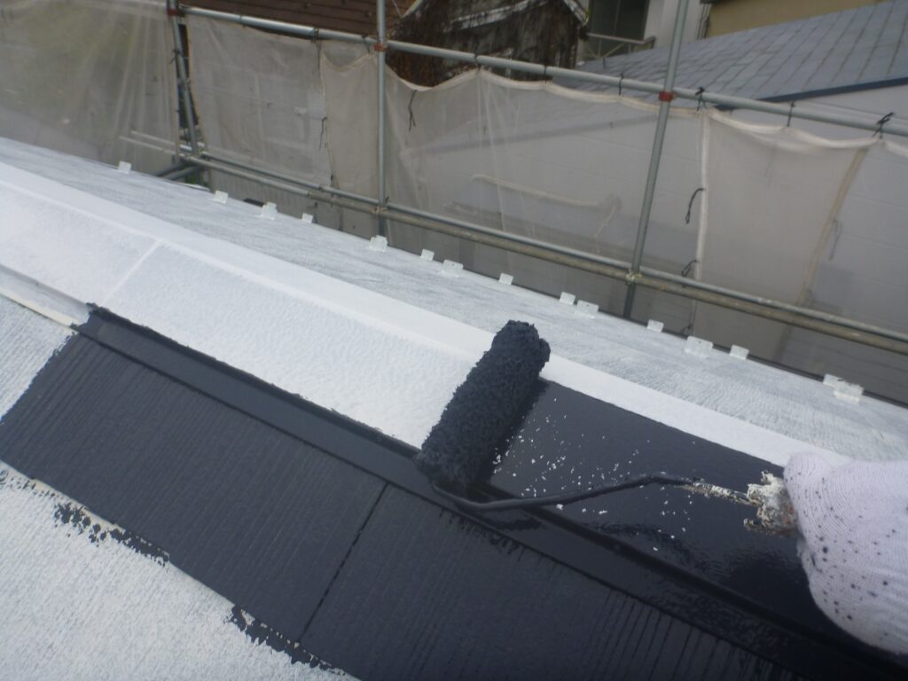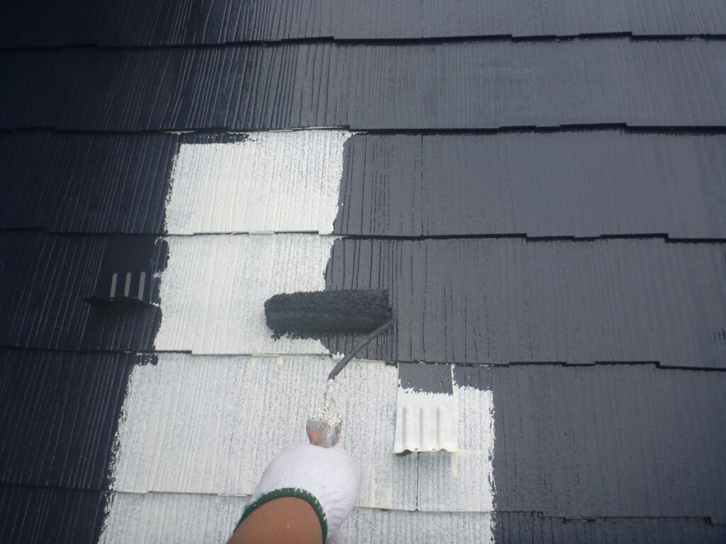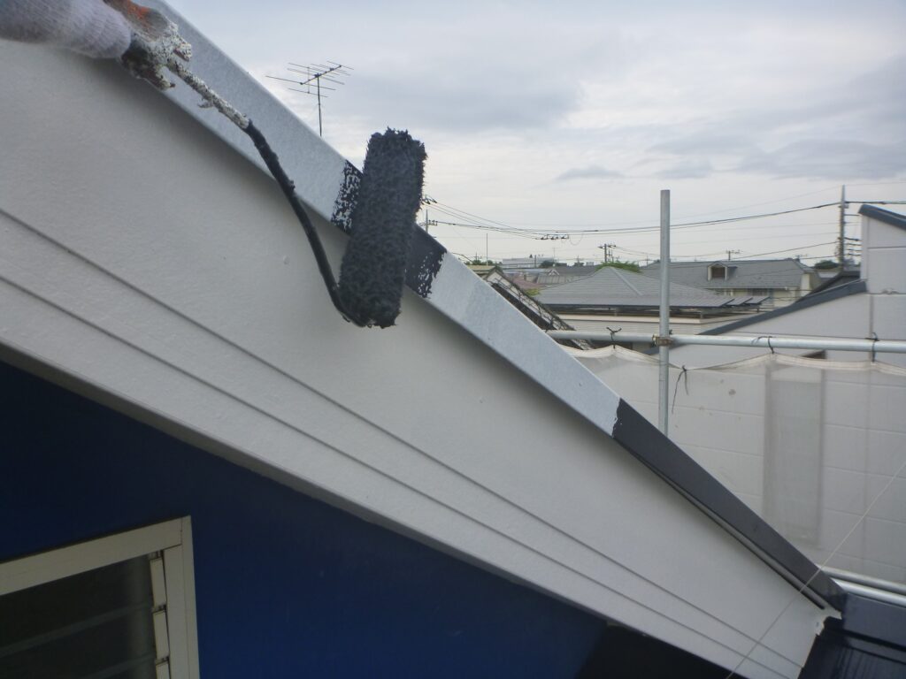 下塗りのシーラーで真っ白になった屋根に中塗りです。