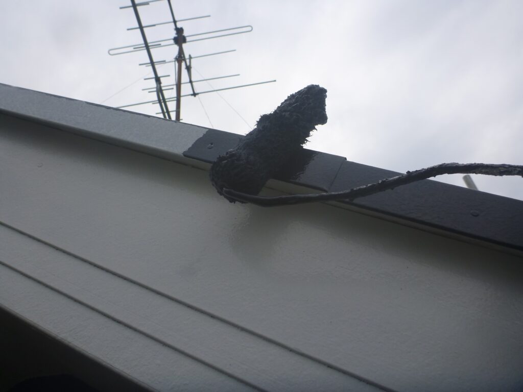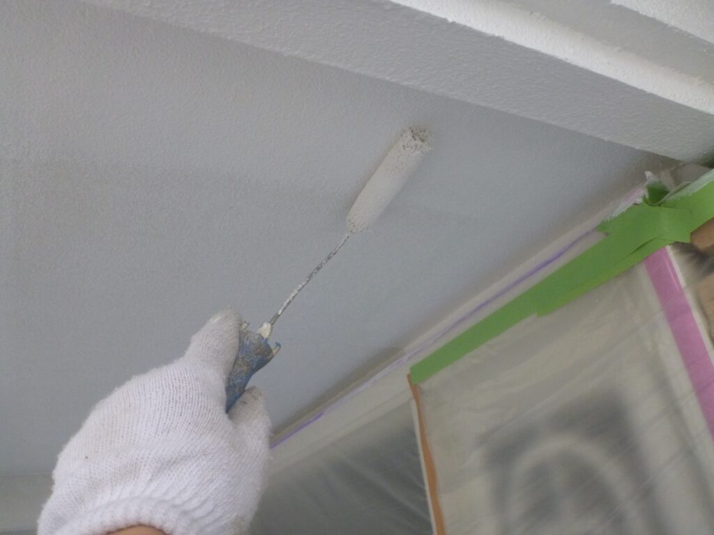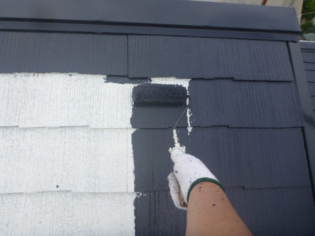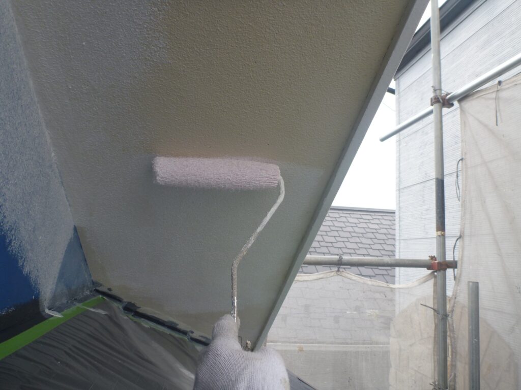下塗りのシーラーで真っ白になった屋根に中塗りです。