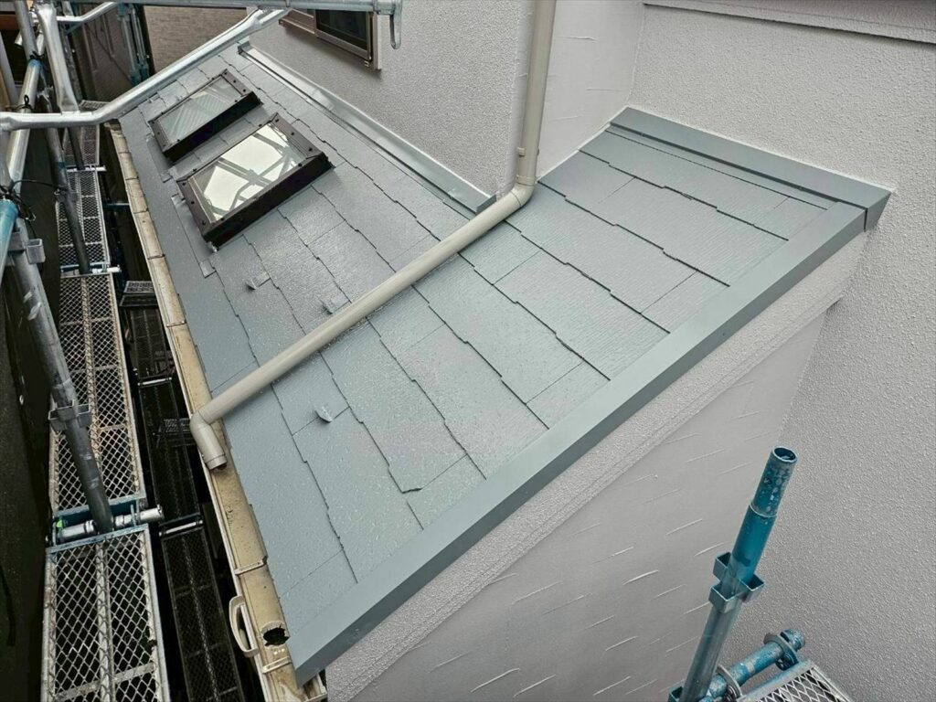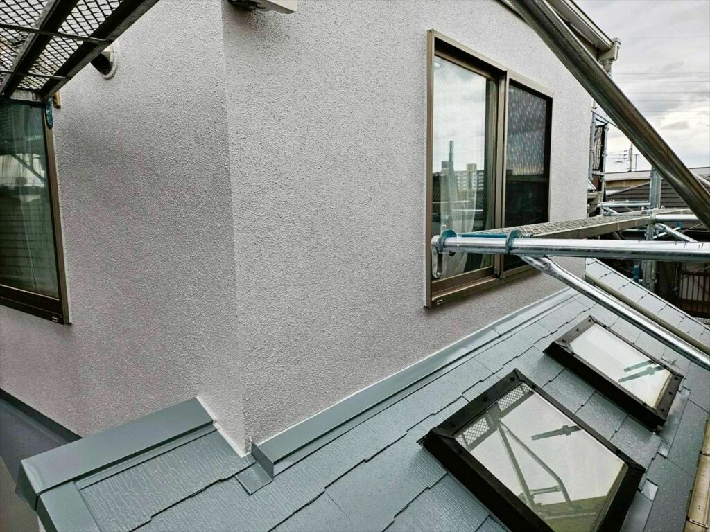 屋根:アステックペイント スーパーシャネツサーモSi(弱溶剤形二液屋根用遮熱上塗材) 付帯: 日本ペイント、ファインパーフェクトトップ(ターペン可溶1液ラジカル制御形ハイブリッド高耐候性塗料) シール:オート化学工業、オートンイクシード(長期耐久型ハイクオリティーシーリング材) |