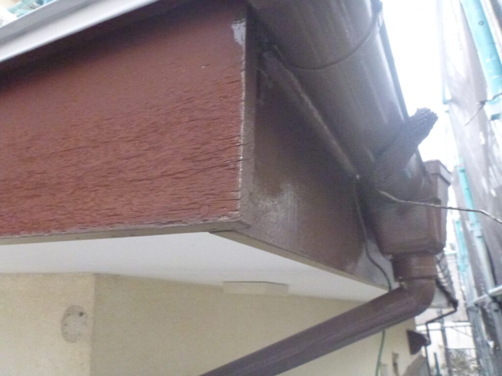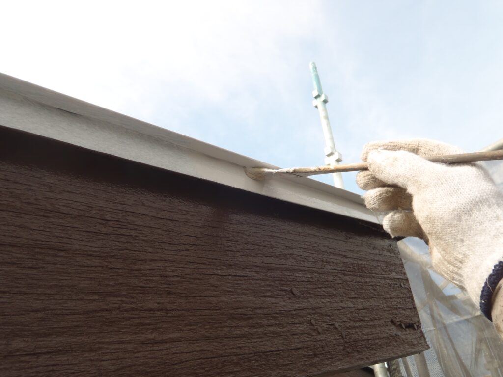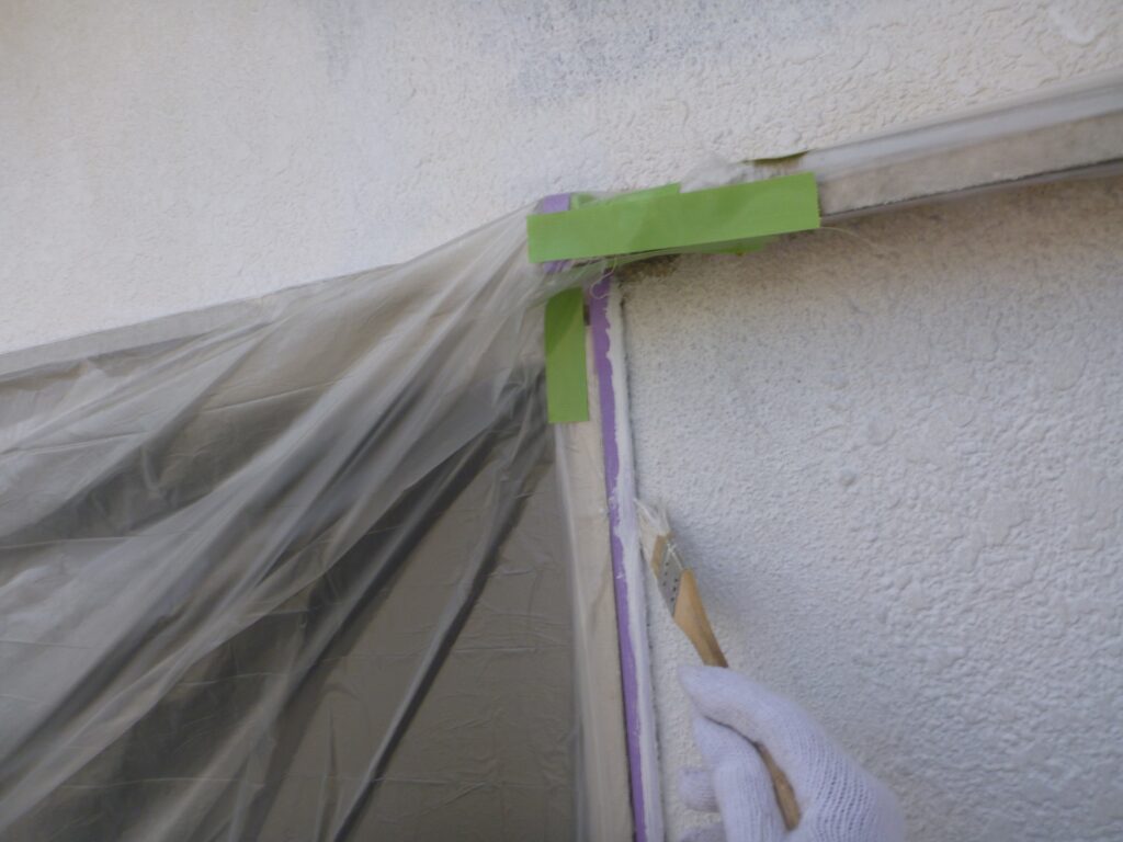 付帯部、屋根の中塗りが終った次は養生を進めます。