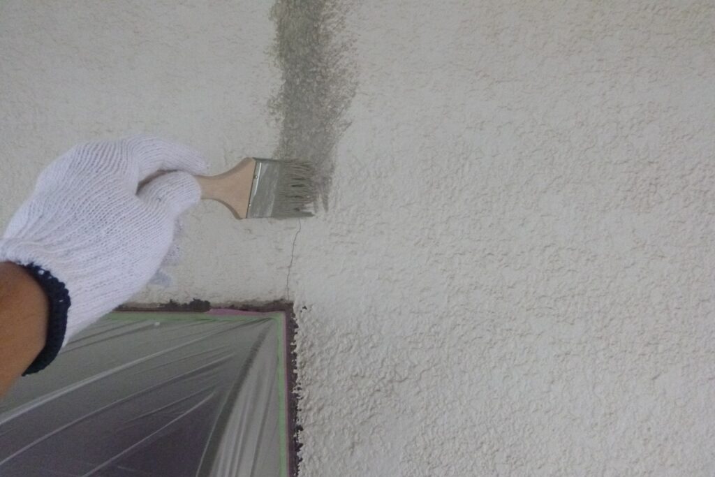 養生が終ったら外壁の塗装がスタートですが、先にひび割れの補修を行います。