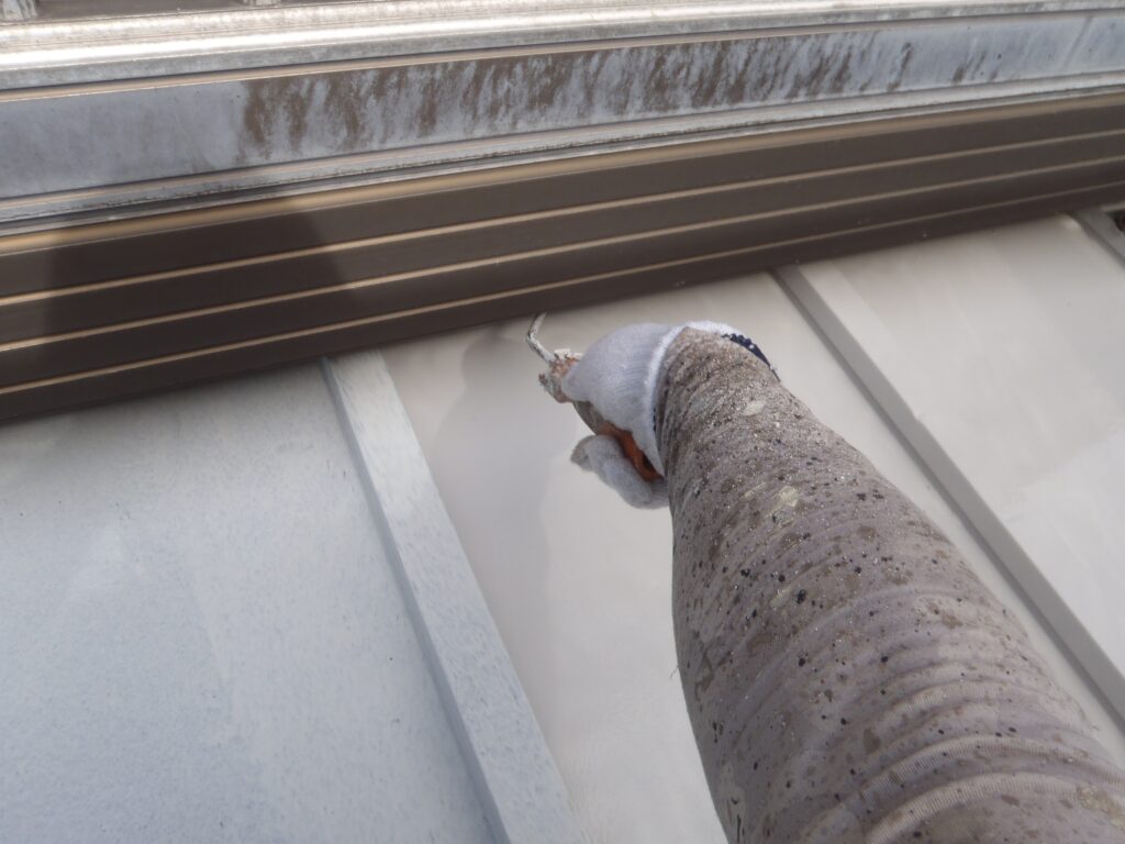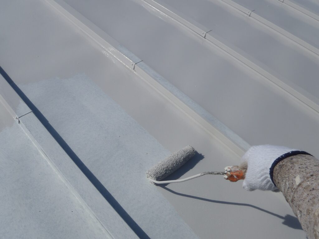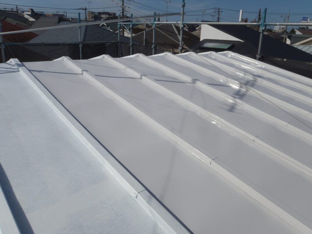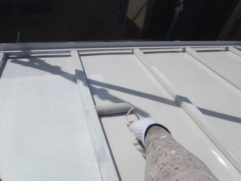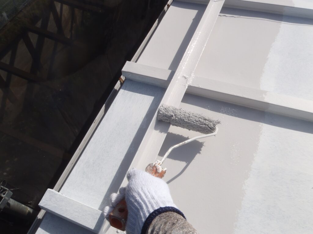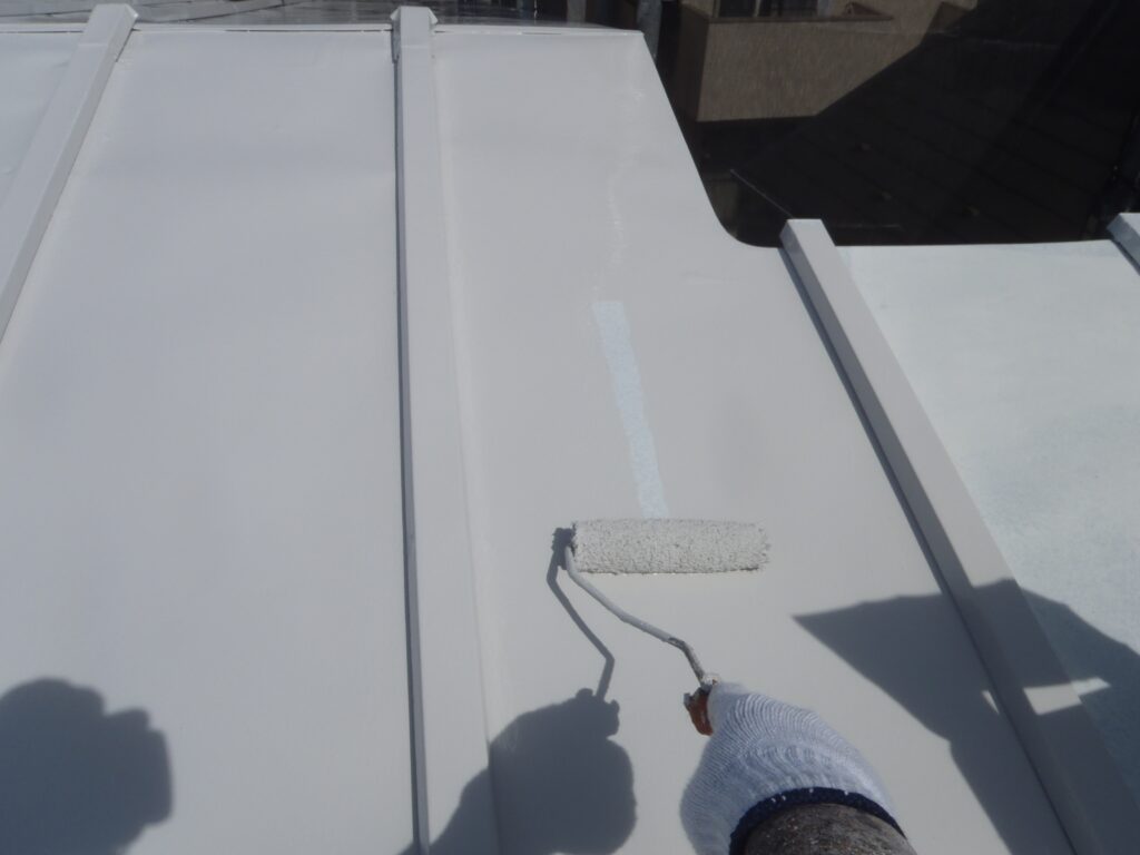 屋根は金属屋根のため、錆止め塗料で下塗りをして真っ白になっています。