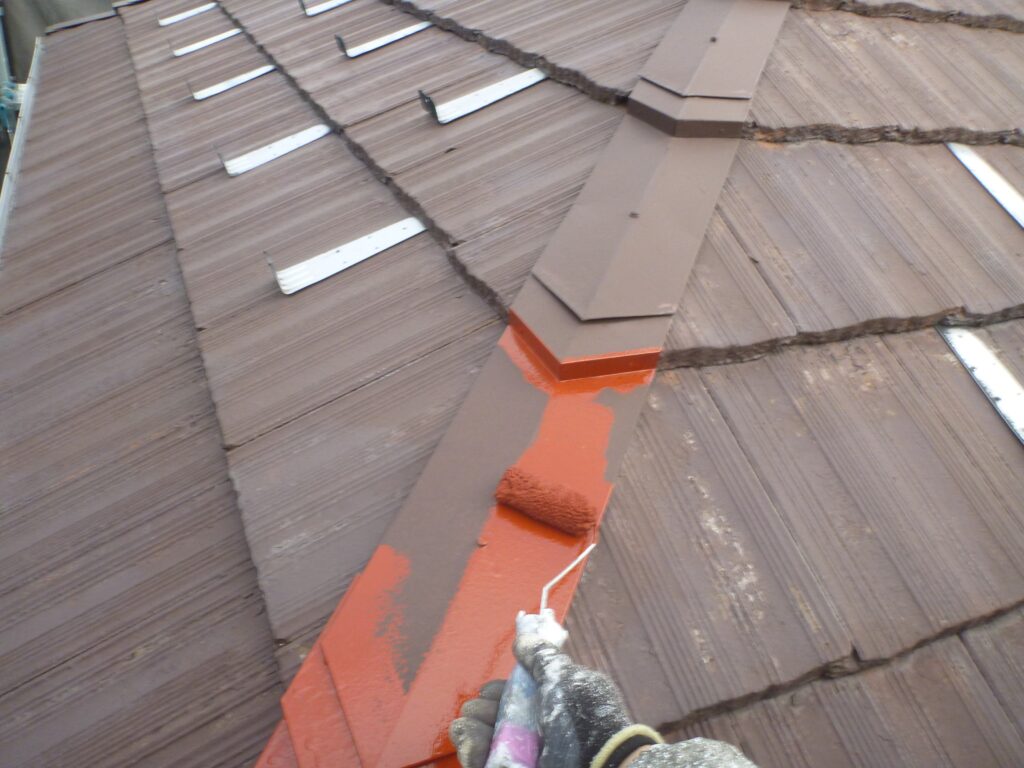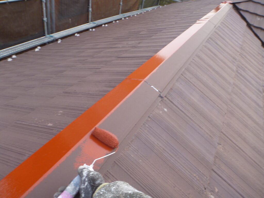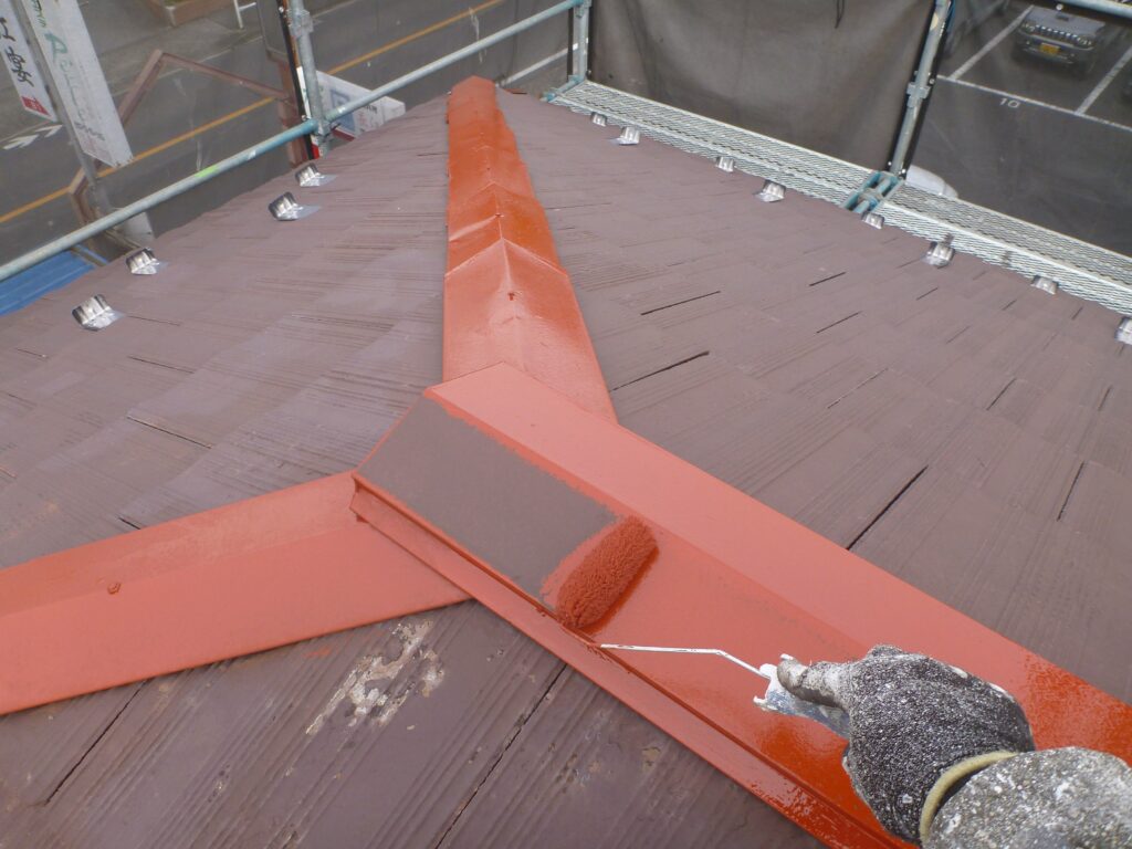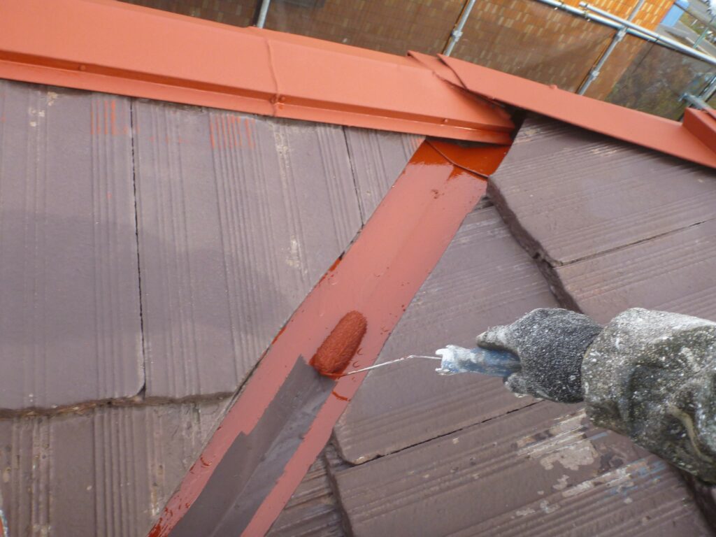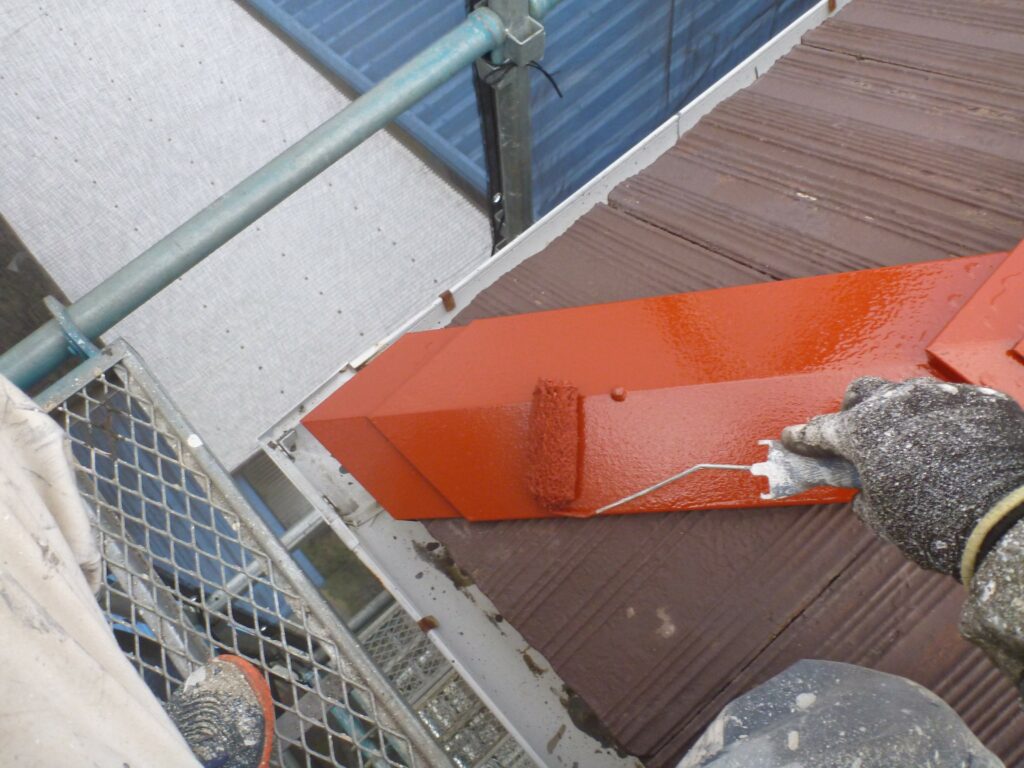 屋根の棟板金は完成時の色が赤系になるので、赤い錆止めを使って下塗りです。