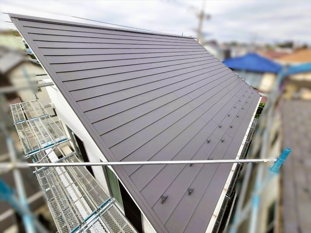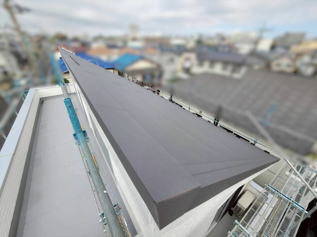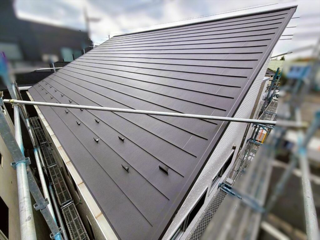 屋根:アイジー工業 スーパーガルテクト 色Sシェイドチャコール 付帯: 日本ペイント、一液ファインフッソUV シール:オート化学工業、オートンイクシード |