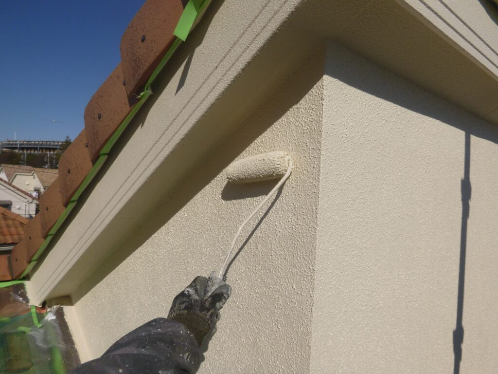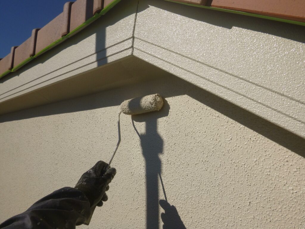 外壁は中塗りまで終っているので仕上げの上塗りです。