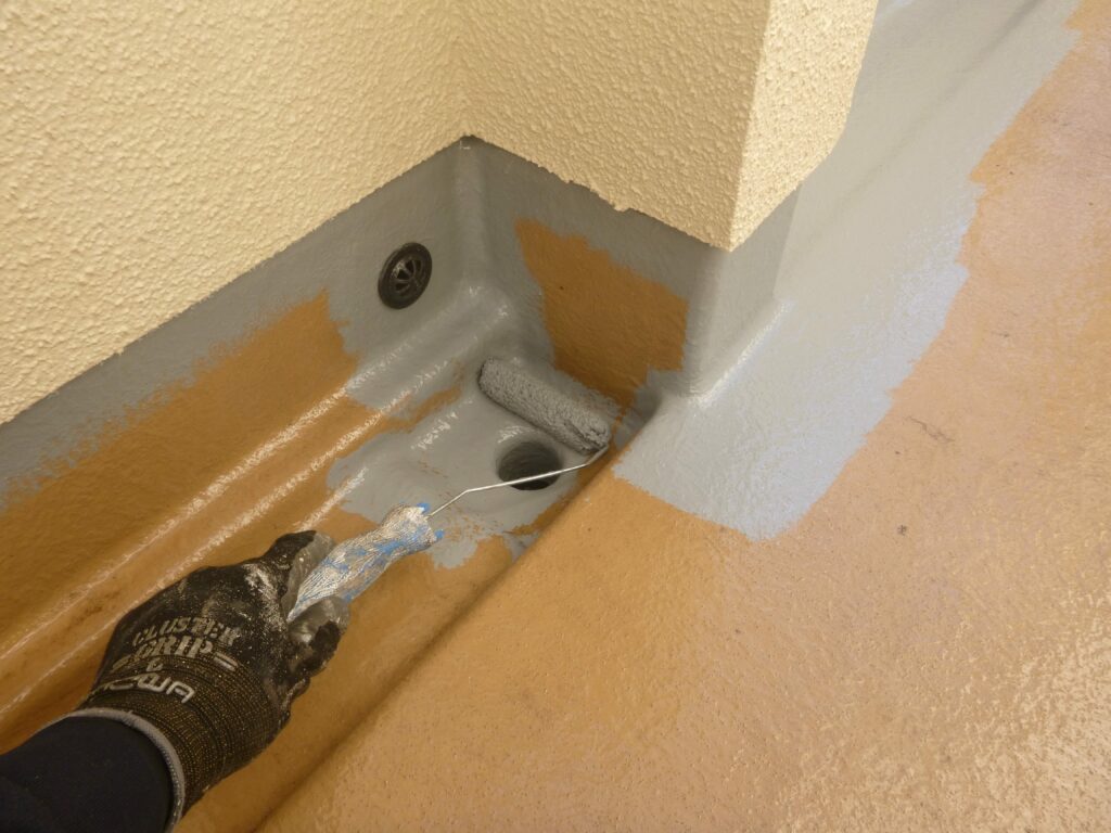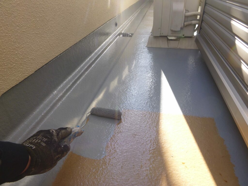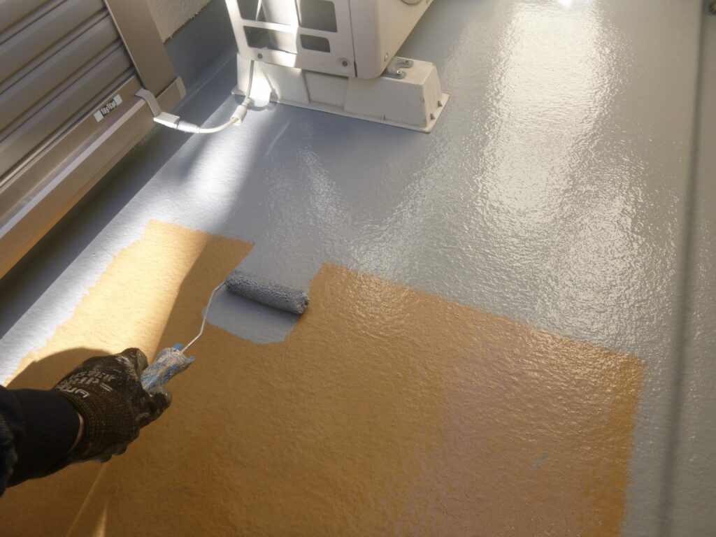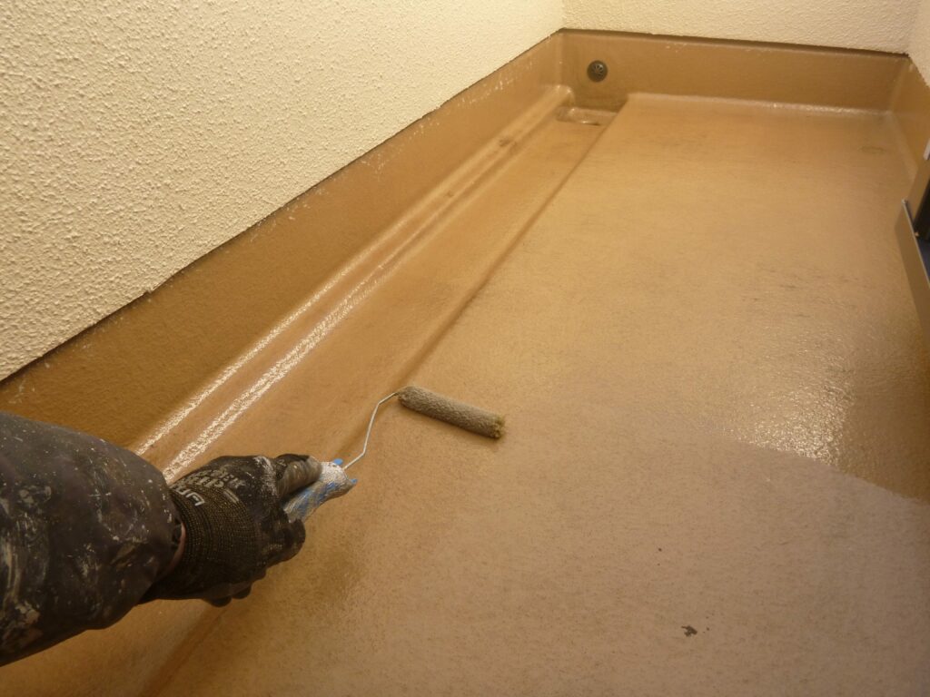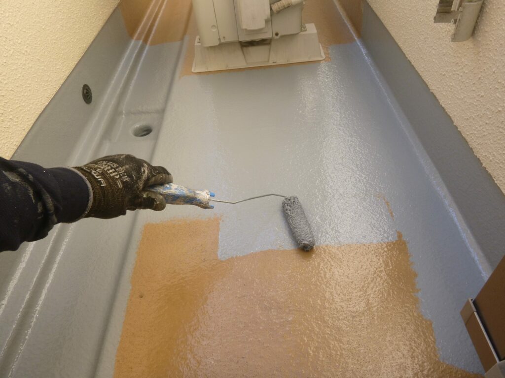 ガラス繊維と樹脂の層を重ねて作られる防水方式で、紫外線から守るためにトップコートが塗装されています。