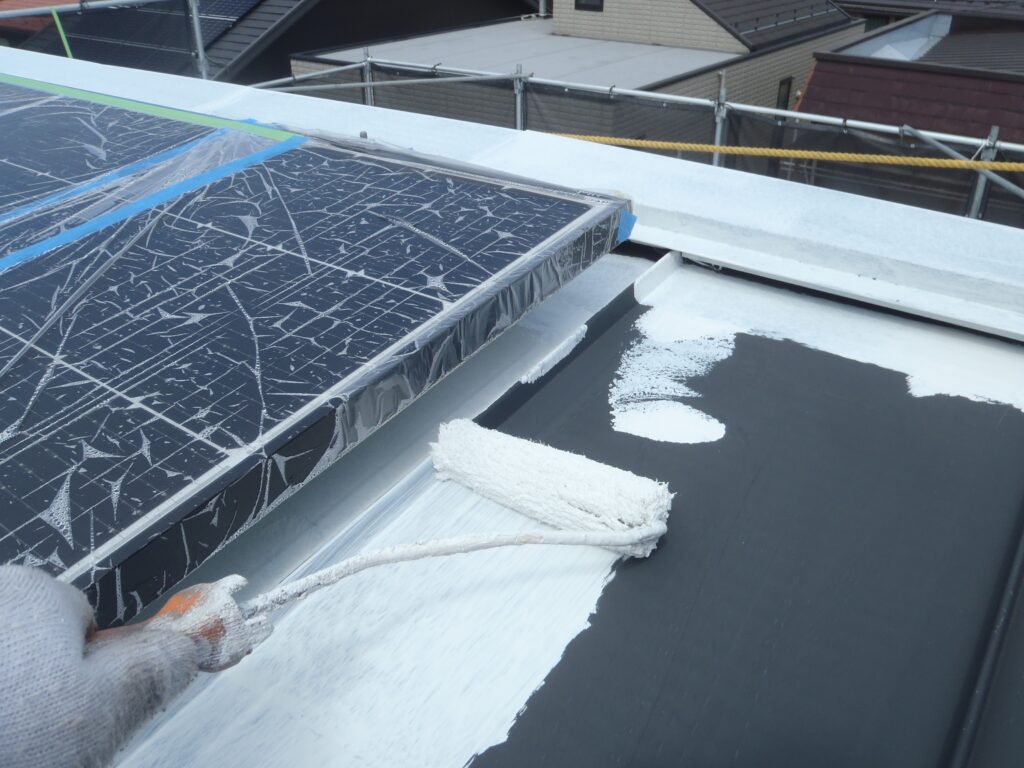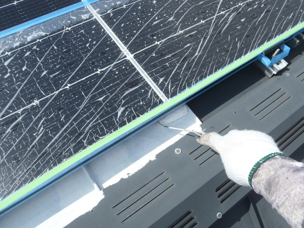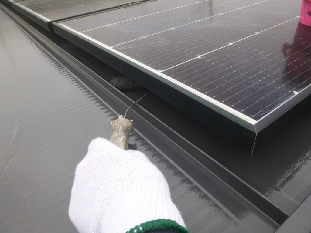ソーラーパネルに塗料が散らないように養生をしてあります。